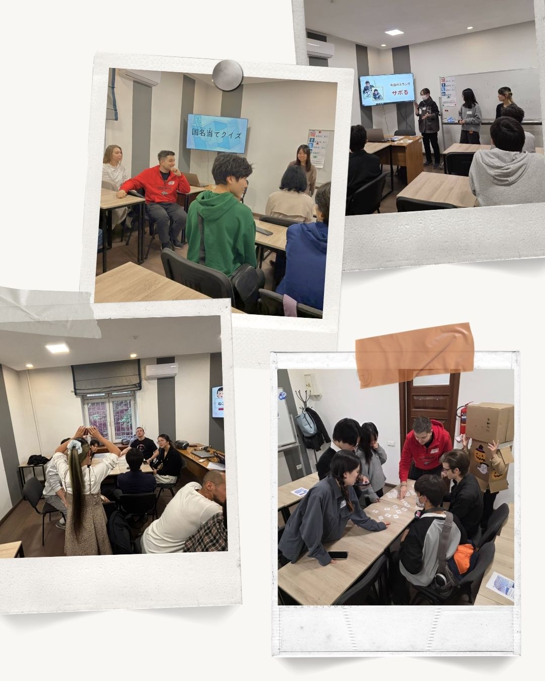 Клубдун өзгөчө пайдасын Япониядан келген биздин стажёр-студенттер берет: алар сабактарды жүргүзүшөт, сүйлөө адаттарын оңдоп жардам беришет, маданий нюанстарды түшүндүрүшөт жана табигый тил чөйрөсүн түзүшөт.